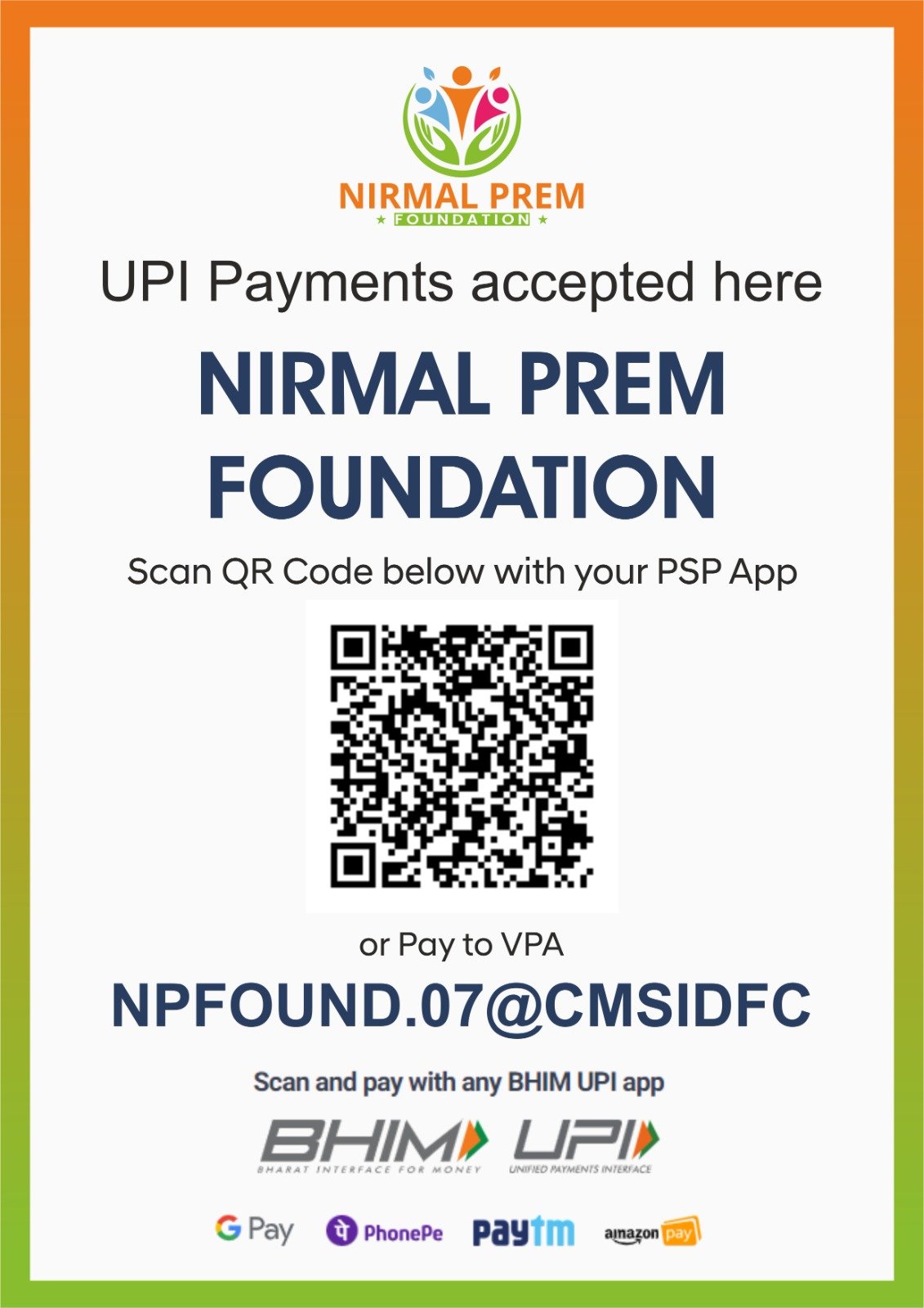 Account Name : Nirmal Prem Foundation